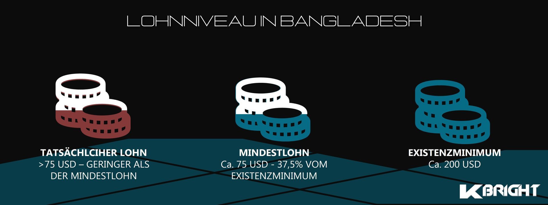 Beispielsweise liegt der nationale Mindestlohn in Bangladesch bei etwa 8.000 BDT, was ungefähr 75 US-Dollar entspricht (Kurs vom 22.11.2023). Laut der Forschung des Deutschen Instituts für Entwicklungspolitik (2019) ist dies erheblich niedriger als das geschätzte Existenzminimum von 16.000 bis 22.000 BDT für eine Familie mit vier Personen, das Wohnen, Essen und Bildung einschließt.